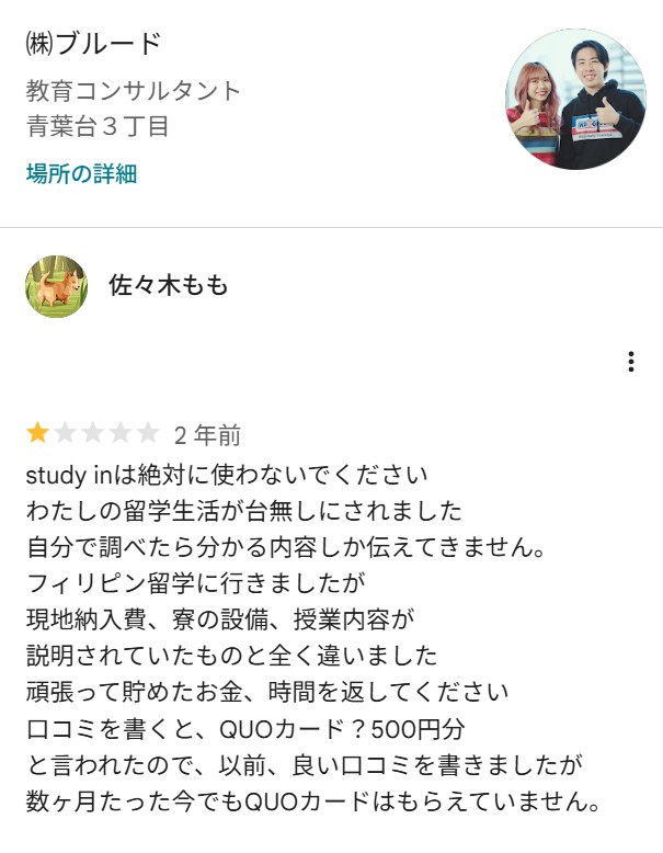 株式会社ブルード、スタディイン(StudyInの運営会社)に書かれていた口コミ