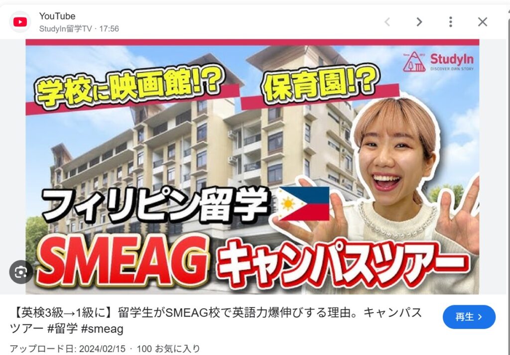留学エージェント(スタディイン)は英検3級⇒英検1級まで伸ばせる!と推薦しているセブ島の語学学校SMEAG。実態はそれとは大きく違うようです。