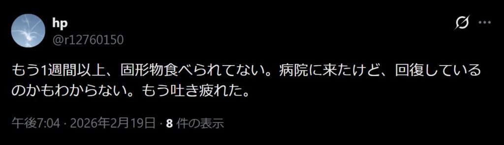もう1週間以上、固形物食べられてない。病院に来たけど、回復しているのかもわからない。もう吐き疲れた。