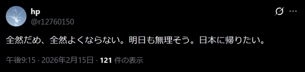 全然だめ、全然よくならない。明日も無理そう。日本に帰りたい。