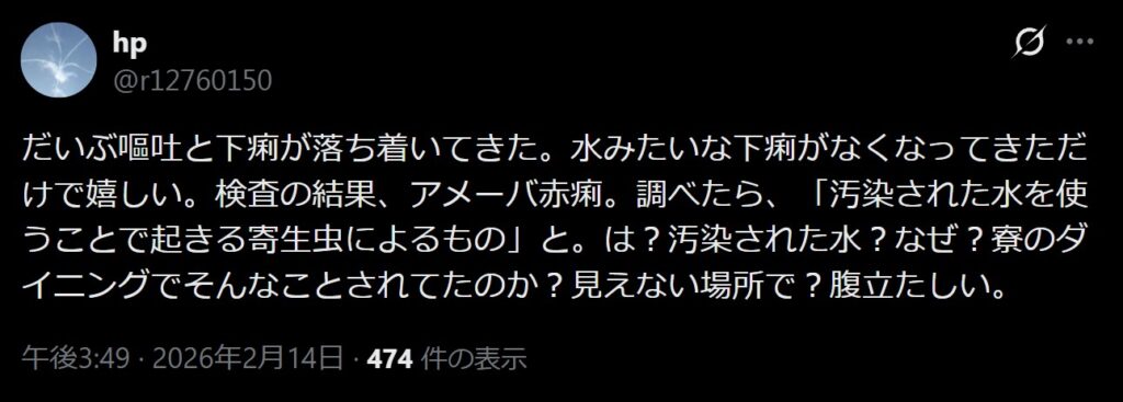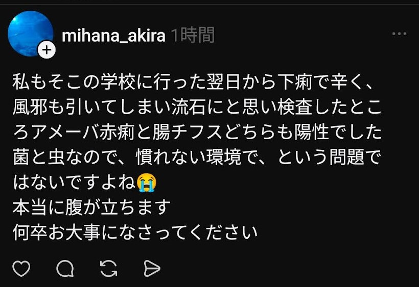 アメーバ赤痢にかかった生徒さんも居て、正直何も信用できません。全てが疑心暗鬼です。