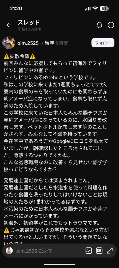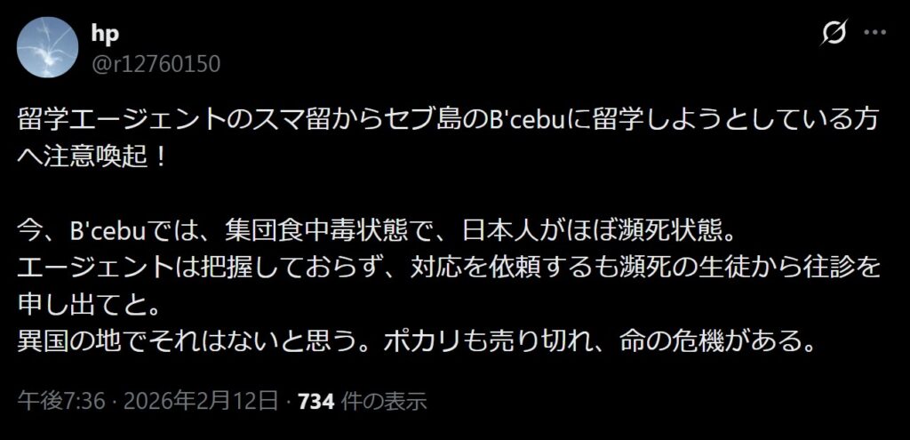 【注意喚起】フィリピン・セブ島の語学学校B’Cebuに留学中、日本人の間で嘔吐・下痢・高熱の症状が多数発生。