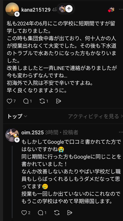 時間もお金もかけて異国の地まで来たのに、こんなことあり得ない。腹立たしい。時間もお金も返してほしい。辛い。普通に語学を学びたくて来たのに。なんで?なんですぐに対応しないの?