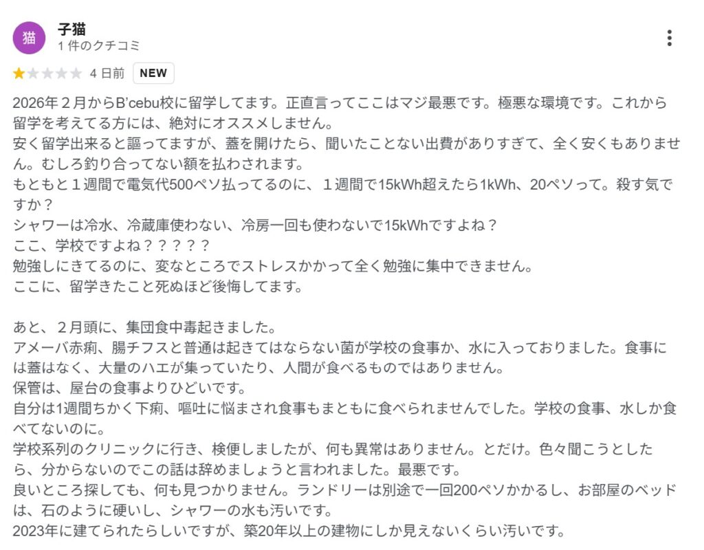 2026年2月からB’cebu校に留学してます。正直言ってここはマジ最悪です。極悪な環境です。これから留学を考えてる方には、絶対にオススメしません。