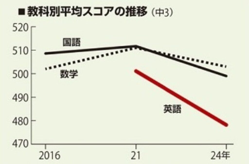 左下のグラフ「教科別平均スコアの推移」を見ると、国語や数学も緩やかに低下していますが、英語の下げ幅は他教科を圧倒しています。