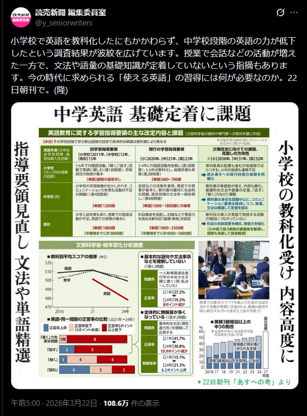 「小学校から英語科目を導入することによって、逆に中学段階の英語力が低下した」という読売新聞の投稿がTwitter(X)上で100万回以上表示されて大きく注目されました。