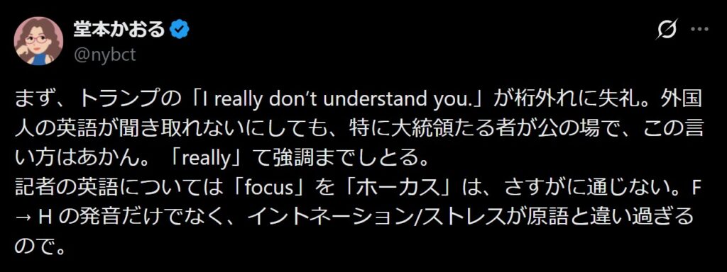 まず、トランプの「I really don’t understand you.」が桁外れに失礼。外国人の英語が聞き取れないにしても、特に大統領たる者が公の場で、この言い方はあかん。「really」て強調までしとる。