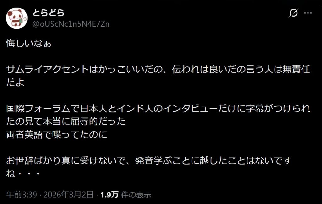 一方で、第二言語で発言した勇気と職務を全うしようとした姿勢には敬意を示している。