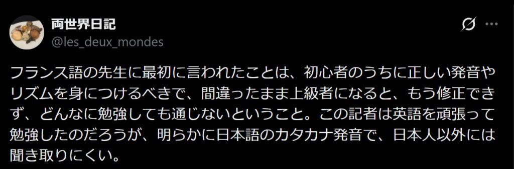 語学の先生※に最初に言われたことは、初心者のうちに正しい発音やリズムを身につけるべきで、間違ったまま上級者になると、もう修正できず、どんなに勉強しても通じないということ。