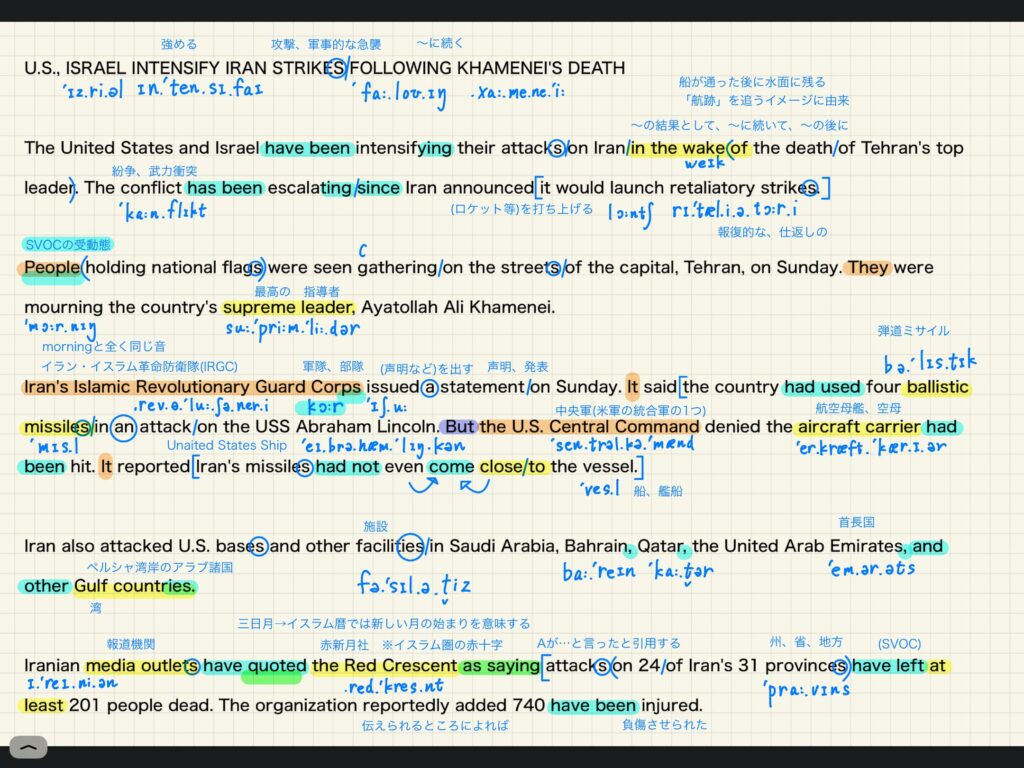 私は分かりやすく読めるように、黄色・緑・青・紫のマーカーを追加し、青のボールペンでの書き込みを加えました。それぞれの配色は当然それぞれ別々の文法規則に従って使い分けています。