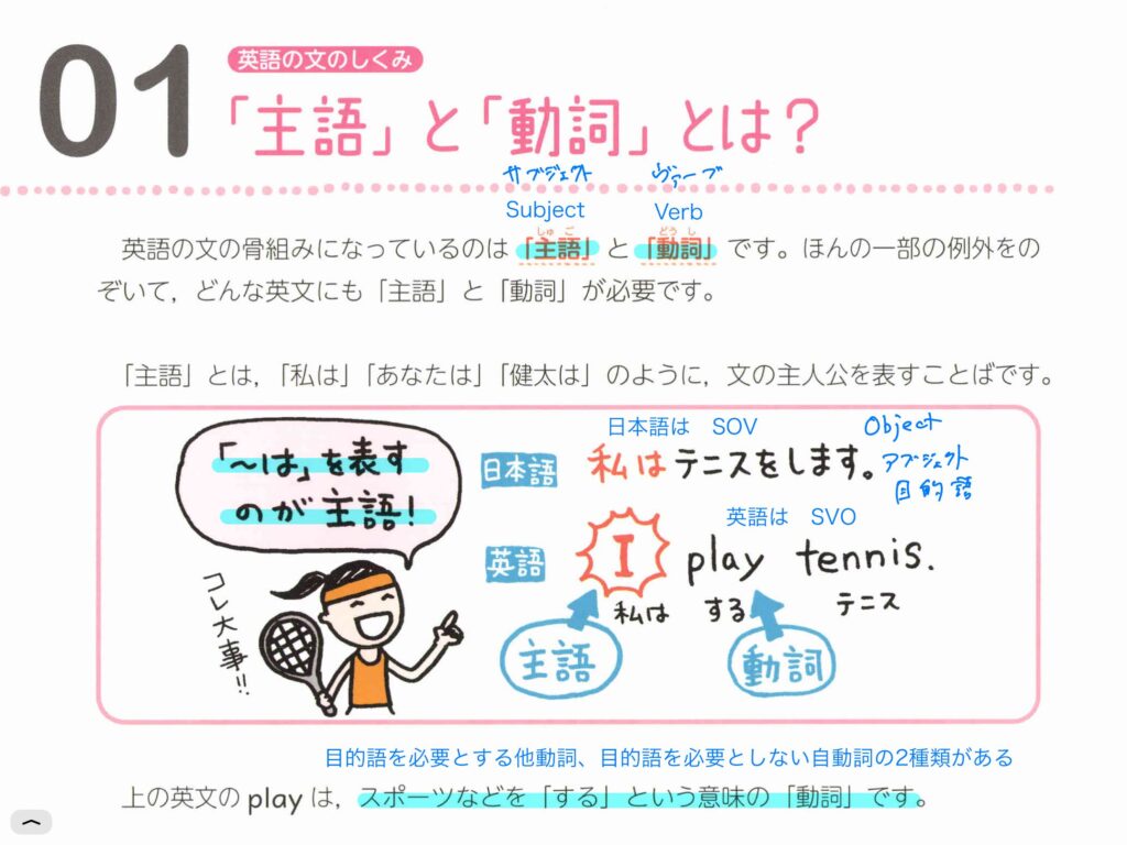 (参考画像: 中学1年生が学ぶ英文法の参考書、「主語」と「動詞」という言葉の定義から学習を開始します。)
