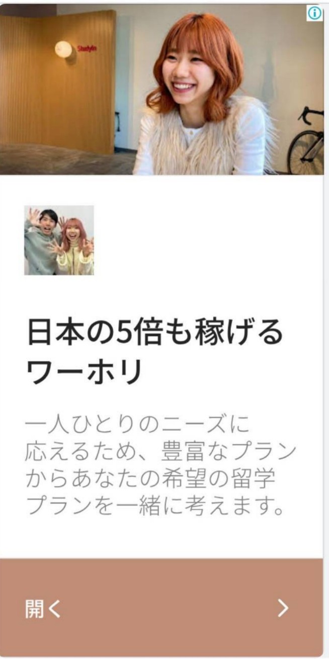 例えば下記の投稿はStudyIn英会話(アンジー・清家のコンビが人気)を運営している留学エージェント会社の広告です。